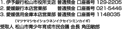 しかし、これらの活動に係る財源は、主に参加団体による会費と市の補助金で賄うこととしておりますが、健全育成にかかわる活動をより活発化するためには多額の資金を必要としております。今を生き、未来を担う子どもたちのために、「松山市青少年育成市民会議」の活動の趣旨をおくみ取りいただき、皆様の財政的なご援助を賜りますよう心からお願い申し上げます。